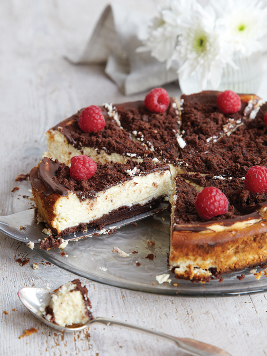 Šokoladą sulaužome gabaliukais ir ištirpiname virš puodo su verdančiu vandeniu pastatytame dubenyje (taip, kad vanduo neliestų dubens dugno, o tik kaitintų jį garais). Nemaišome, leidžiame šokoladui pačiam lėtai tirpti. Kai jau yra beveik ištirpęs, šiek tiek pamaišome. Ištirpintą šokoladą užpilame ant varškės pyrago ir išlyginame peiliu. Iškeptas papildomas tešlos juosteles sutrupiname rankomis ir užbarstome ant šokoladu ištepto pyrago viršaus. Viskas – tram tam tam. Papuoškite šį kepinį avietėmis.